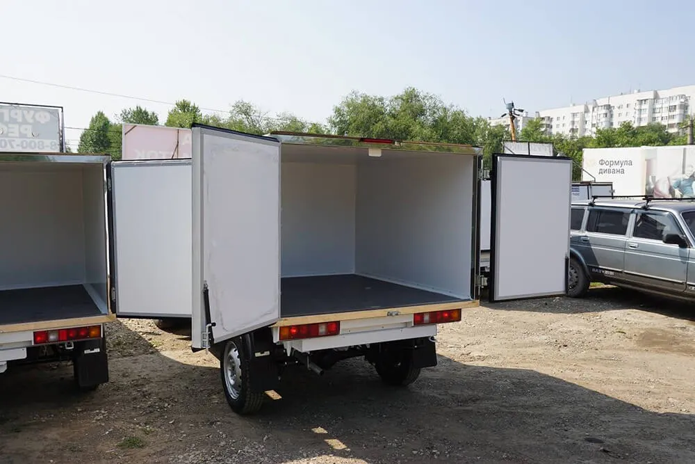 Описание для фургонаВнешняя обшивка – крашенная оцинкованная сталь, внутренняя обшивка - пищевая оцинкованная сталь, пол – рифлёный алюминий, портал - нержавеющая сталь. Двери - задние распашные. Запоры штанговые одинарные. Фургон выполнен под установку холодильного оборудования в Ульяновске.
